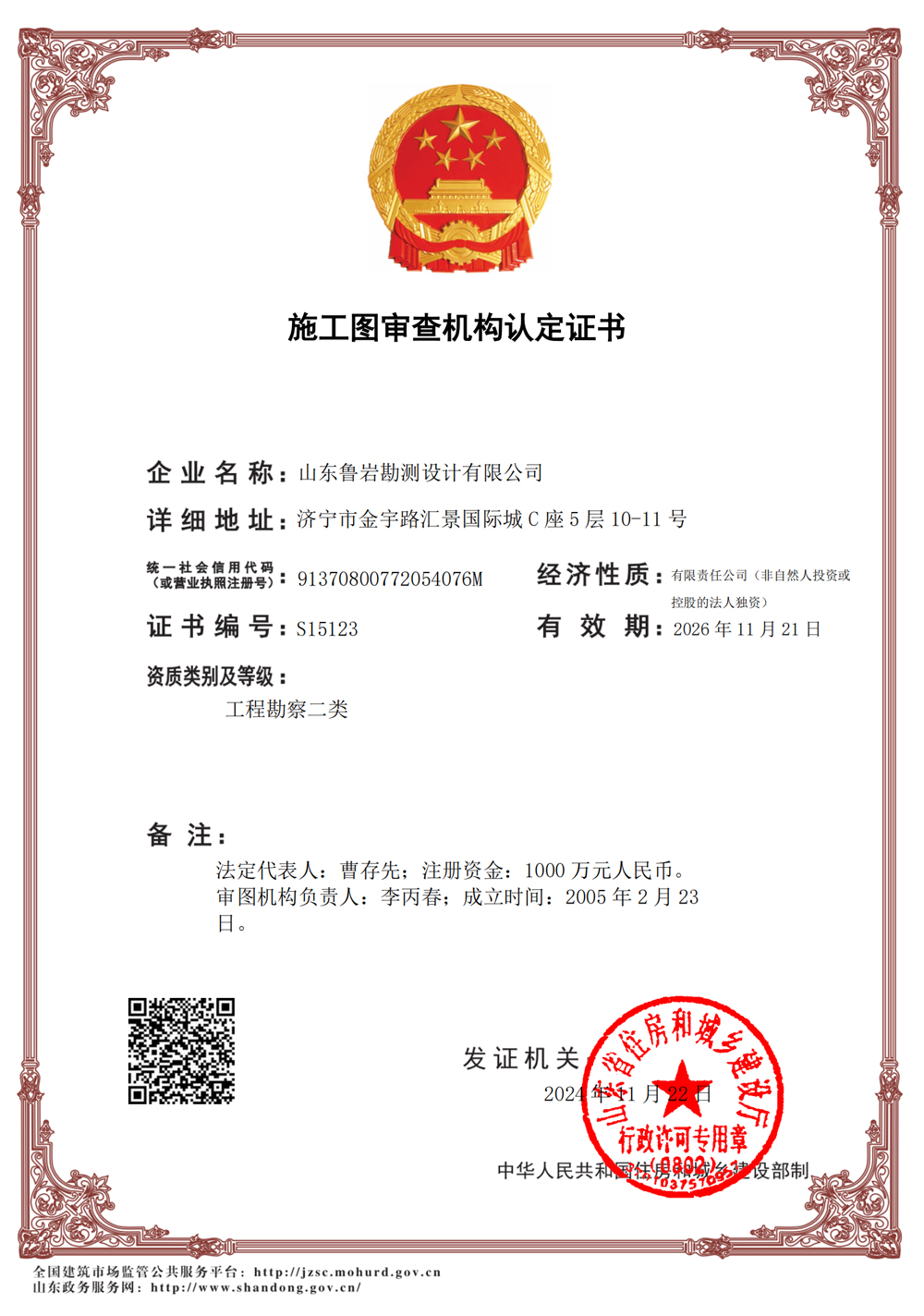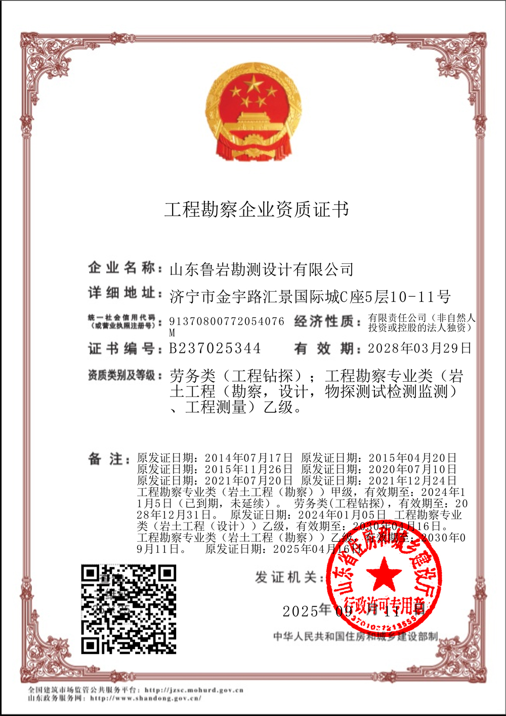 工程勘察专业类(岩土工程(勘察,设计、物探测试检测监测)、工程测量)乙级;劳务类(工程钻探)